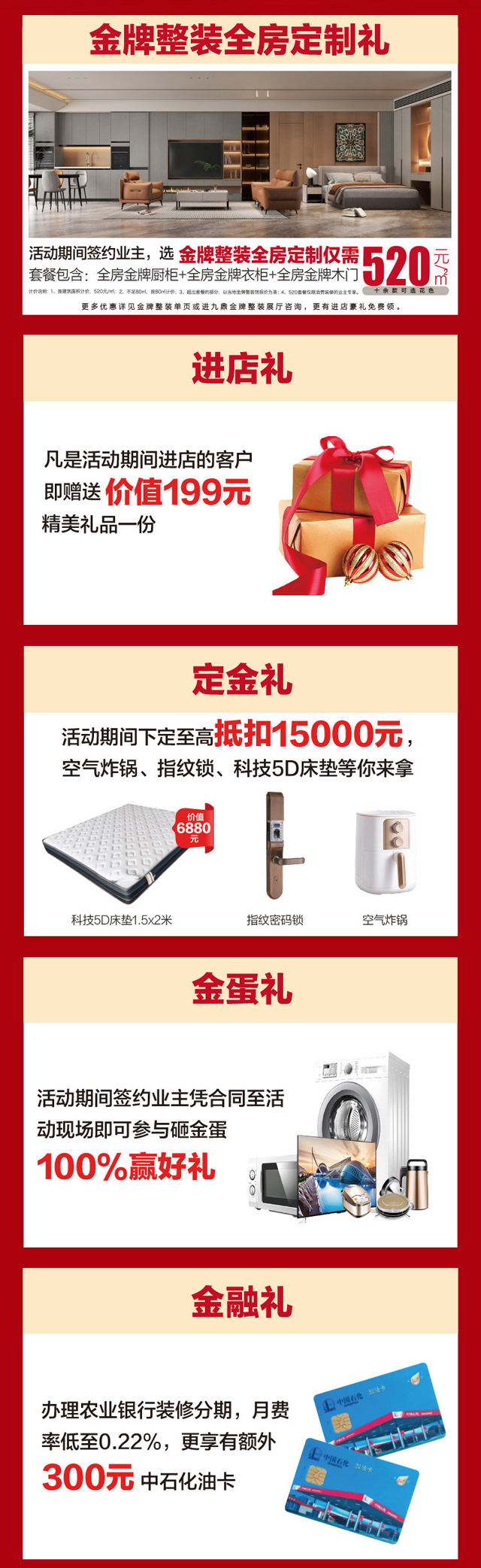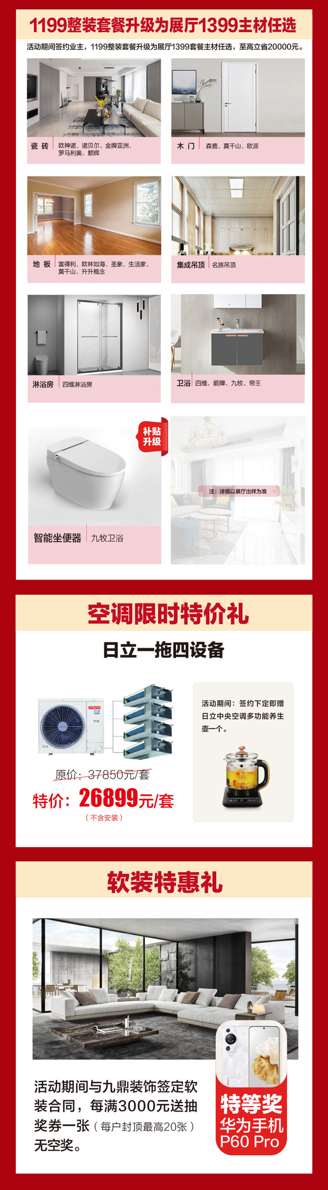 新(xin)店(diàn)開業,驚喜福利火熱開場(chang),钜惠活動(dòng)紛至沓來。不僅有(yǒu)金牌整裝(zhuang)的(de)全屋定製(zhi)禮,還有(yǒu)主(zhu)材(cai)升級禮,軟裝(zhuang)特惠禮,空調特價禮等(deng)你來!