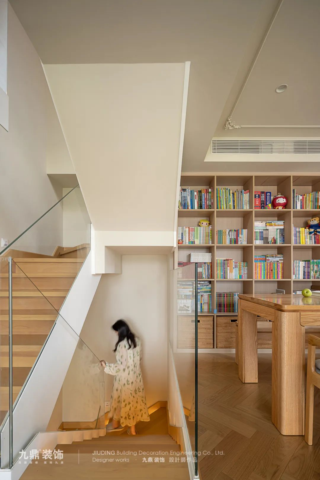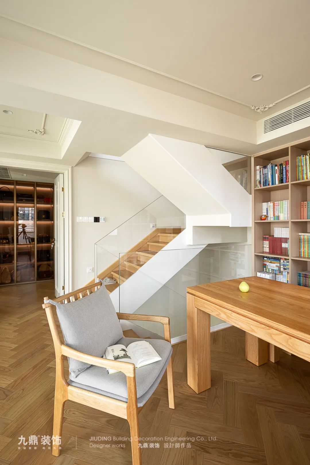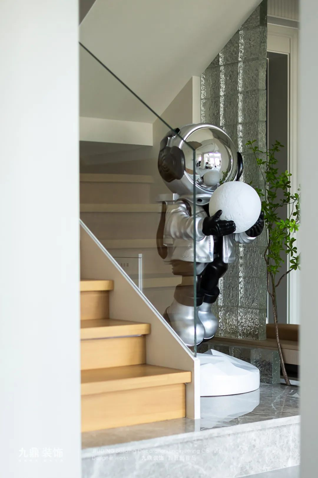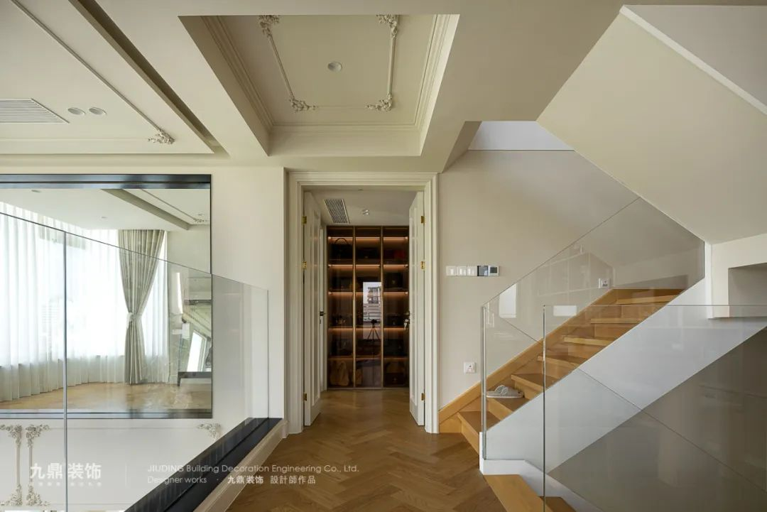 樓梯采用(yong)原木(mù)色地闆,隐蔽的(de)線(xiàn)性燈光仿佛将每一(yi)步踩在(zai)浪漫之(zhi)上。透過(guo)玻璃扶手,光線(xiàn)更加(jia)透亮,不僅增加(jia)了(le)樓梯的(de)現(xian)代(dai)感,還爲(wei)整箇(ge)空間增添了(le)更多(duo)的(de)視覺層次。營(ying)造(zao)出溫馨浪漫的(de)氛圍。