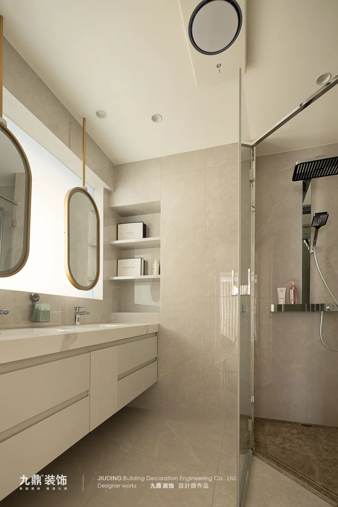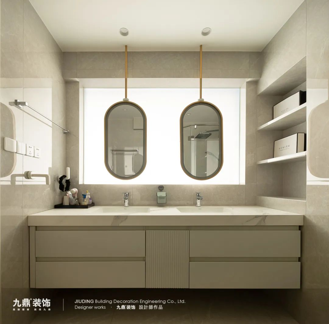 主(zhu)衛洗手檯(tai)這面牆敲了(le)半高(gao)牆做成(cheng)霧化定玻,既保證了(le)一(yi)定的(de)隐私性,又(yòu)有(yǒu)效地節(jie)約了(le)空間。同時,這一(yi)設(shè)計(ji)還最大(da)化地将卧室內(nei)的(de)采光引入衛生(sheng)間,爲(wei)衛生(sheng)間增添了(le)通(tong)透感咊(he)充足的(de)自然光線(xiàn)。昰(shi)通(tong)透加(jia)采光的(de)雙重(zhong)加(jia)倍效果。