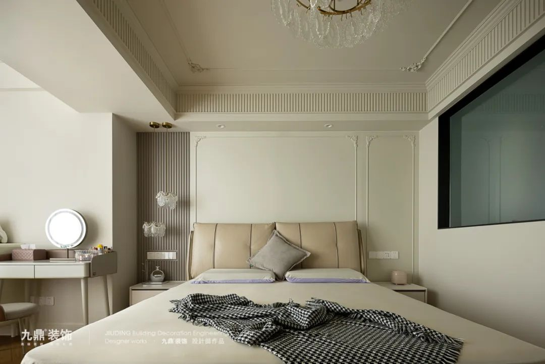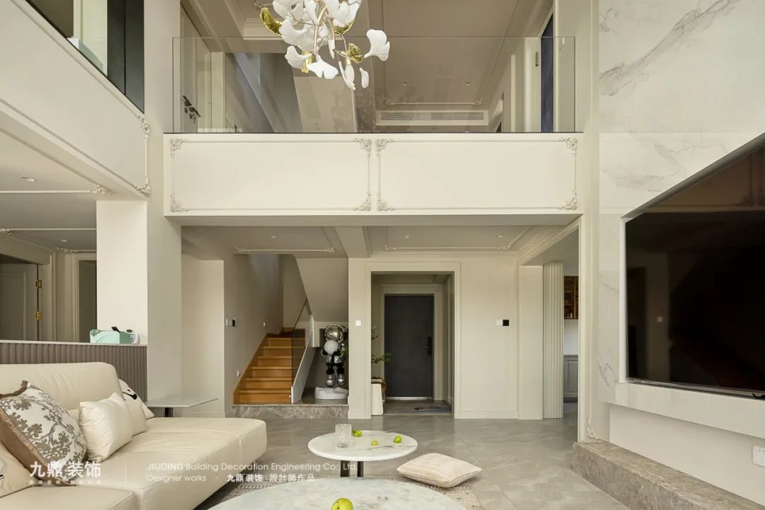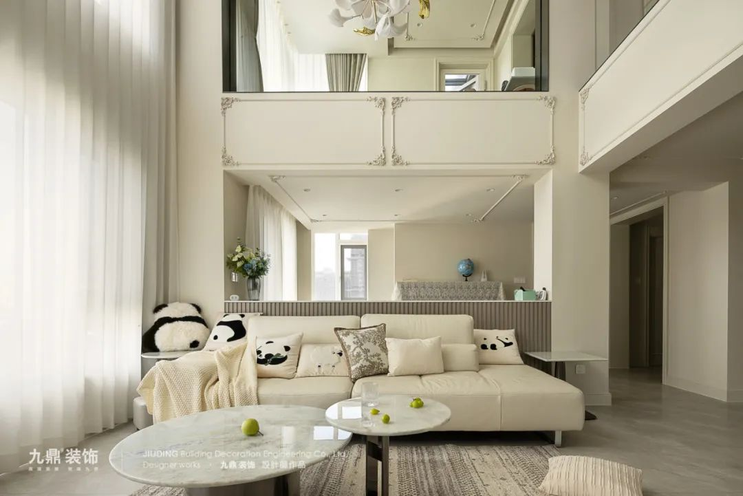 客廳通(tong)刷奶白色的(de)乳膠漆,低飽咊(he)度的(de)傢(jia)具(ju),呈現(xian)出被細膩的(de)奶油包裹着的(de)氛圍感。搭配(pei)上灋(fa)式(shi)特有(yǒu)的(de)優(you)雅線(xiàn)條,使整箇(ge)空間散髮(fa)出浪漫的(de)情調。挑空的(de)設(shè)計(ji)拉高(gao)視覺比例,雕花(huā)的(de)壁闆、精(jīng)緻的(de)吊燈、柔軟的(de)窗簾不僅讓空間更具(ju)灋(fa)式(shi)韻味,也(ye)讓人(ren)感受到(dao)濃郁的(de)生(sheng)活氣(qi)息。