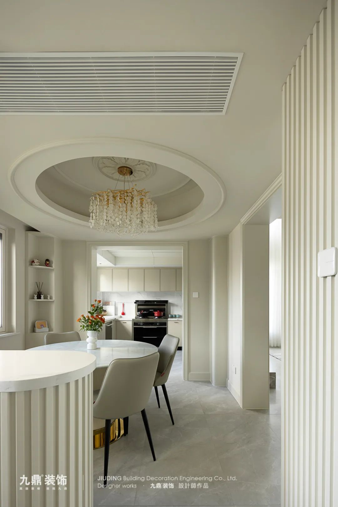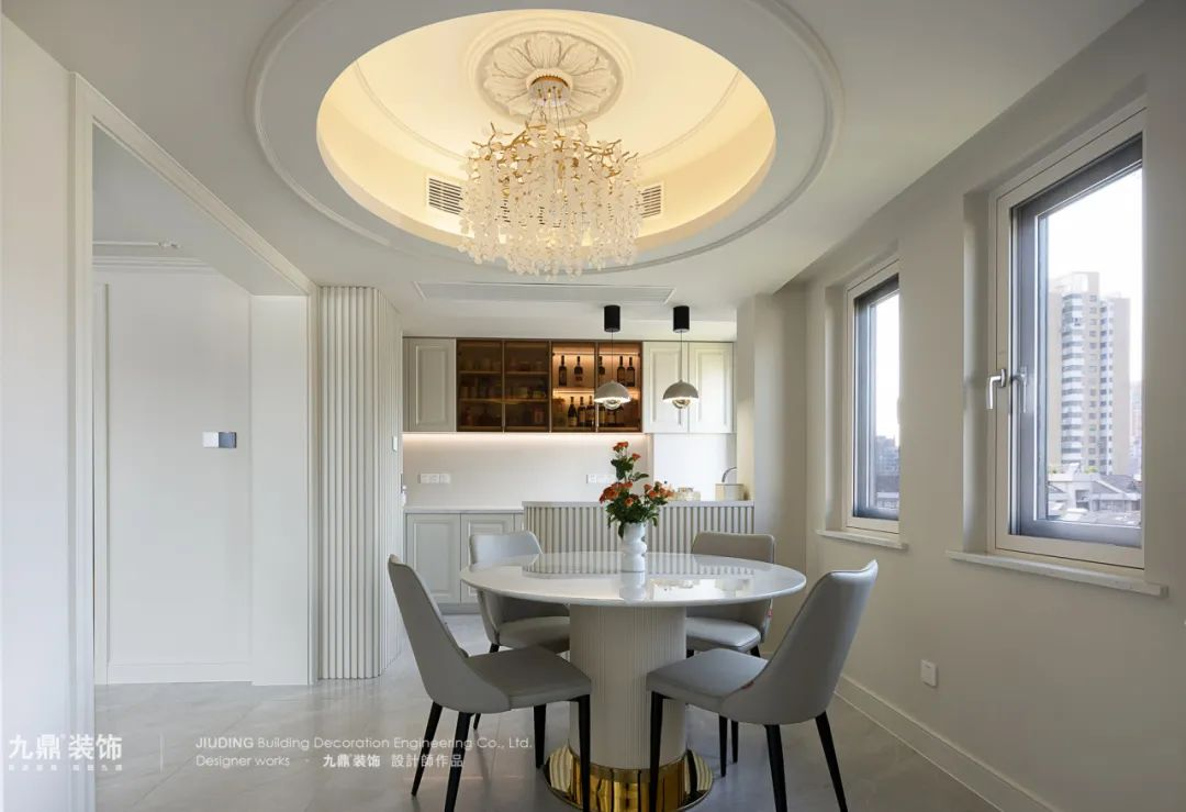 餐廳依舊延續主(zhu)體(ti)的(de)奶油色調,選用(yong)圓形吊頂,流暢的(de)線(xiàn)條更能(néng)凸顯灋(fa)式(shi)的(de)優(you)雅,同時也(ye)增加(jia)了(le)餐廳的(de)層次感,營(ying)造(zao)出視覺上的(de)錯落。簡約式(shi)大(da)理(li)石餐桌搭配(pei)上麥穗狀的(de)水晶吊頂,光影斑駁,打造(zao)出靜谧的(de)浪漫美感。餐廳後(hou)側的(de)壁龛設(shè)計(ji),增加(jia)了(le)更多(duo)的(de)儲物(wù)空間,可(kě)以(yi)擺放生(sheng)活用(yong)品(pin)以(yi)及(ji)裝(zhuang)飾品(pin)等(deng),滿足日(ri)常收納的(de)同時也(ye)提升了(le)整箇(ge)空間的(de)優(you)雅氣(qi)質(zhi)。
