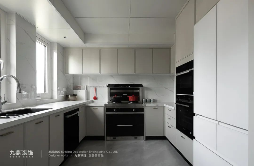 原戶(hu)型廚房空間較小(xiǎo),導(dao)緻就餐區(qu)域(yu)顯得擁擠。爲(wei)了(le)解決這箇(ge)問題,設(shè)計(ji)師拆除進(jin)們(men)處狹長(zhang)的(de)衛生(sheng)間,将其融入廚房空間,從(cong)而擴大(da)廚房的(de)面積。同時,設(shè)計(ji)師将原本(ben)廚房咊(he)餐廳的(de)位置互換,做了(le)一(yi)箇(ge)回遊動(dòng)線(xiàn)中(zhong)西廚設(shè)計(ji),使得原先(xian)擁擠的(de)空間得到(dao)了(le)優(you)化,爲(wei)用(yong)戶(hu)提供了(le)更舒适、實用(yong)的(de)廚房環境。也(ye)擁有(yǒu)了(le)更多(duo)的(de)收納空間。