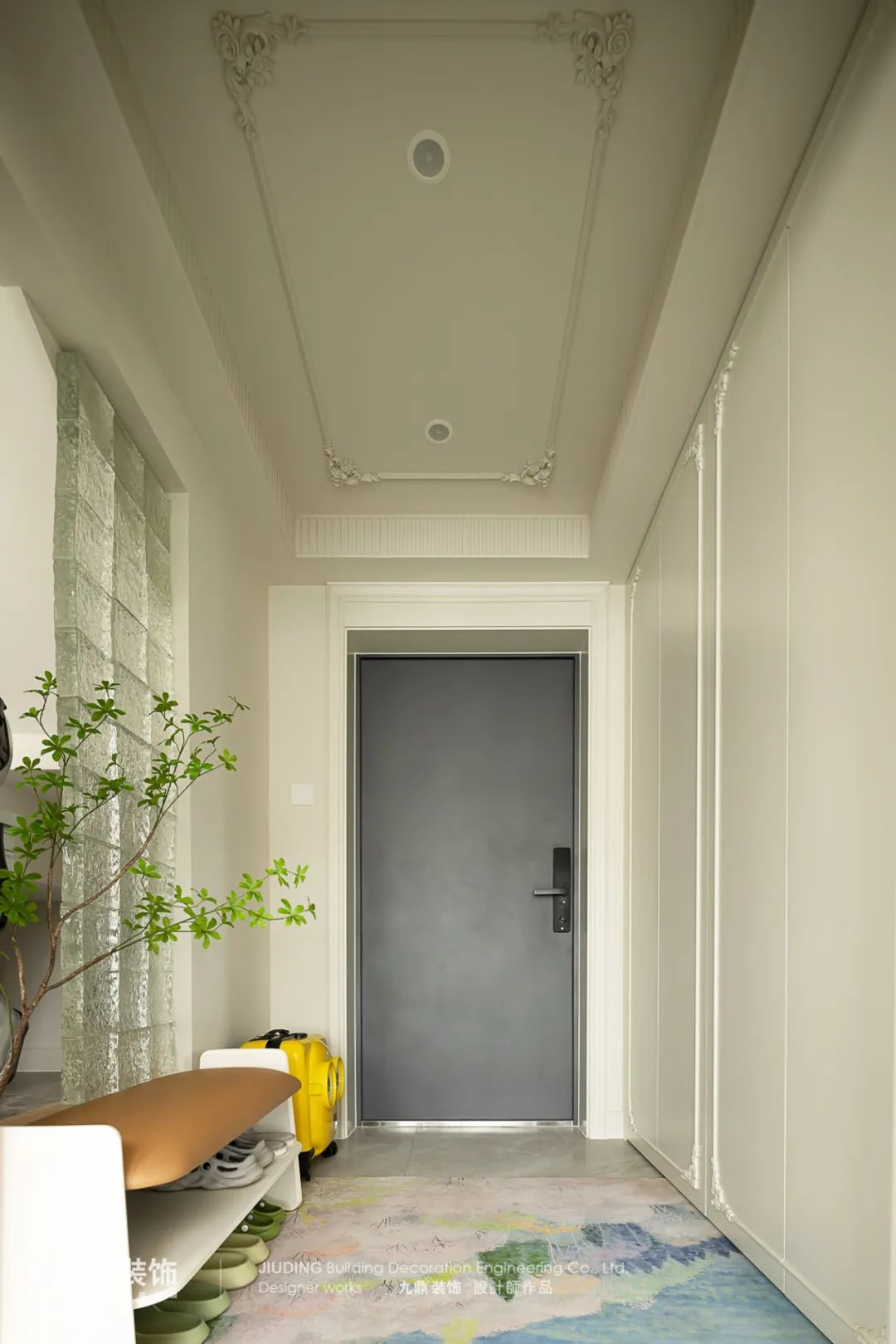 原戶(hu)型的(de)玄關采光差(cha),收納少。設(shè)計(ji)師在(zai)靠樓梯這面砌了(le)半面玻璃磚,一(yi)半镂空連接到(dao)樓梯做的(de)一(yi)箇(ge)透景設(shè)計(ji),使采光更好,同時增加(jia)了(le)收納。打造(zao)了(le)一(yi)箇(ge)過(guo)目(mu)不忘的(de)玄關空間。
