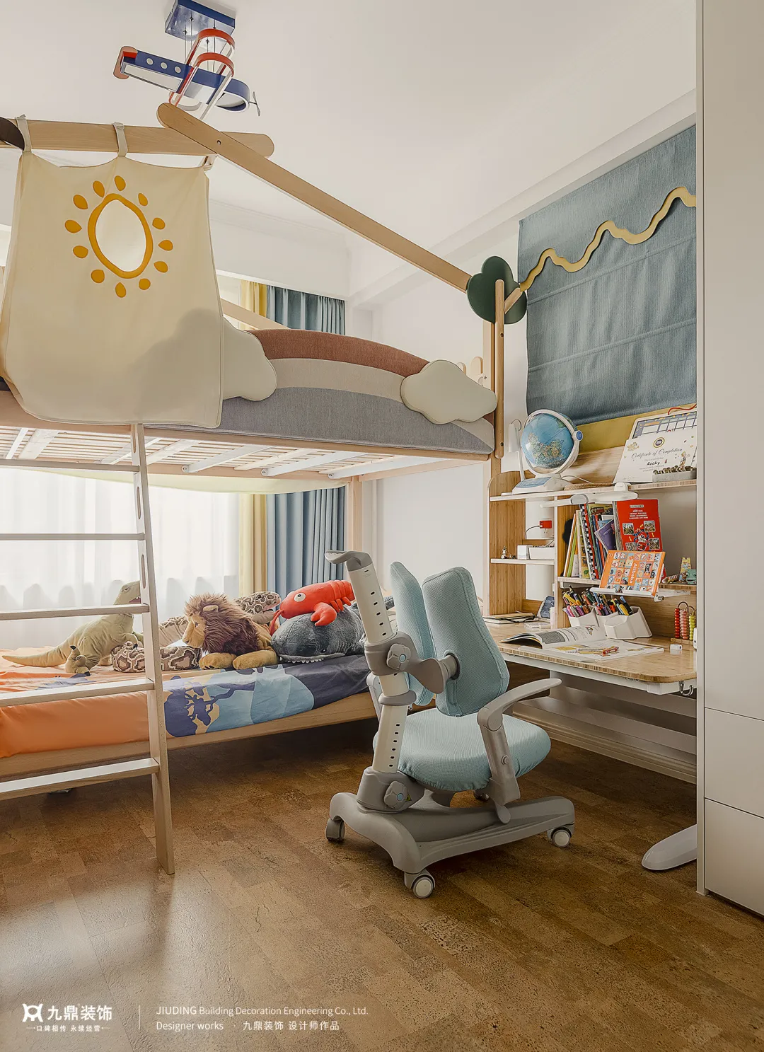 兒童房具(ju)有(yǒu)舒适觸感的(de)軟木(mù)地闆給予孩子(zi)溫暖的(de)守(shou)護,充滿卡通(tong)趣味的(de)玩偶,讓空間更活潑、充滿童趣。