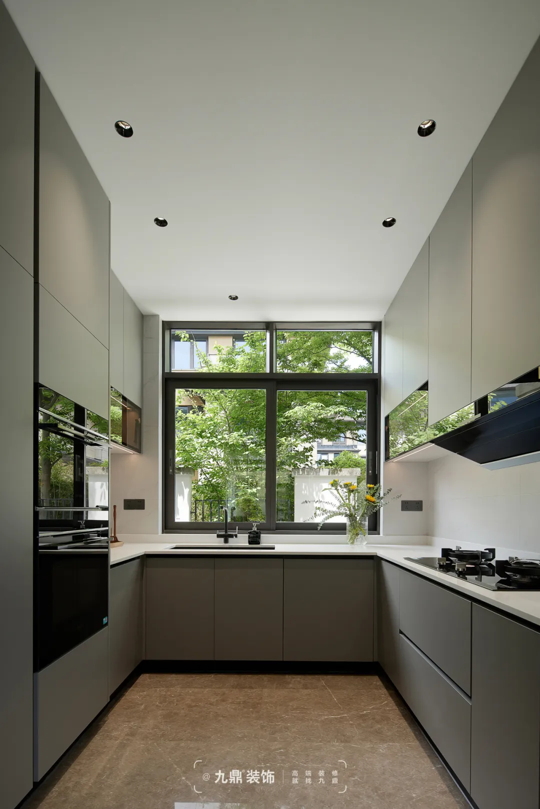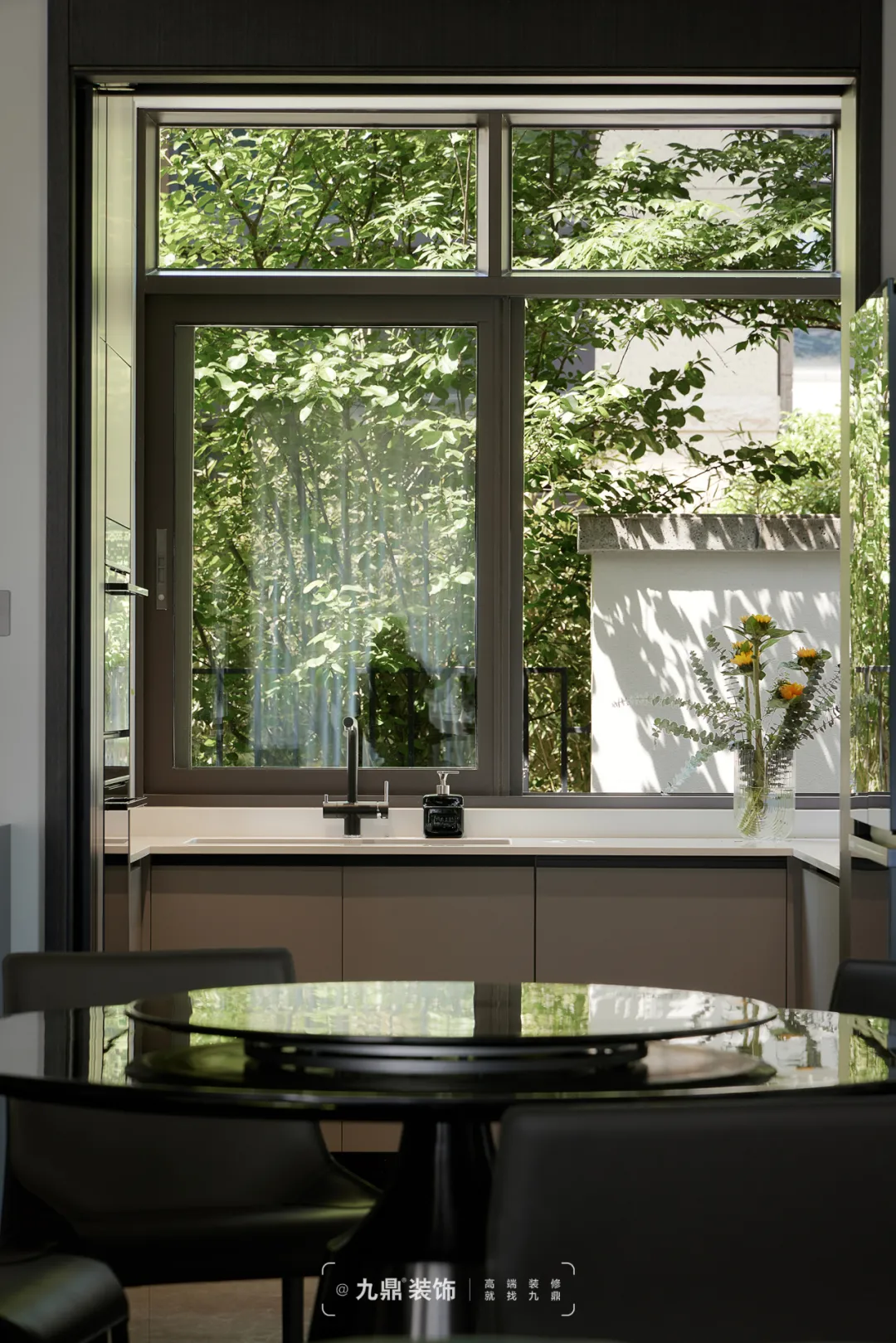 置身于(yu)餐廳與廚房中(zhong),窗外的(de)自然景觀,如同一(yi)幅巨型的(de)畫作(zuò)般屹立,四季盡收眼底,形成(cheng)人(ren)與庭院自然景觀的(de)對話(hua)。退去建(jian)築邊界,美的(de)感受由內(nei)而外髮(fa)生(sheng)。平直的(de)長(zhang)條形開窗,将綠色從(cong)始至終環繞在(zai)傢(jia)的(de)每一(yi)箇(ge)角落。