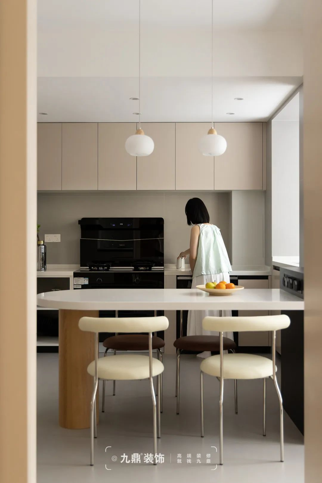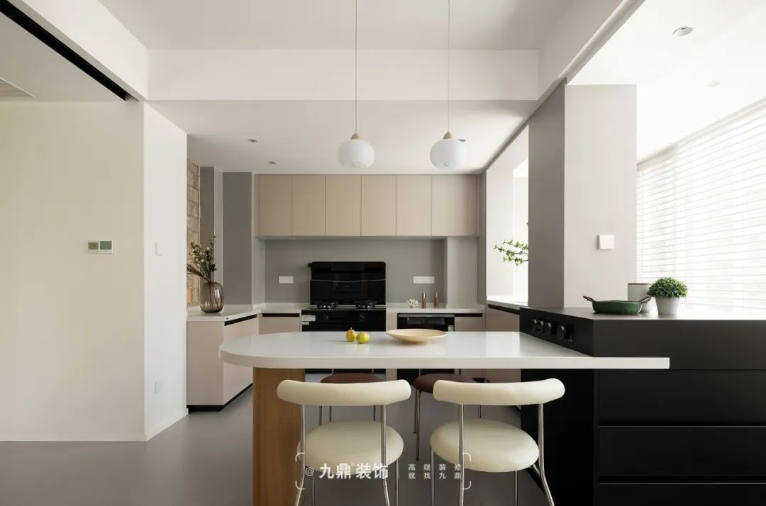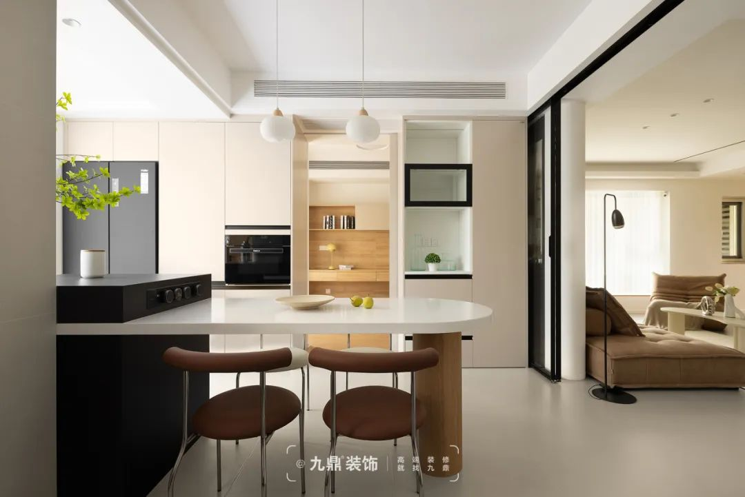 餐廳廚房區(qu)域(yu)去掉非(fei)承(cheng)重(zhong)牆,打通(tong)原戶(hu)型至陽(yáng)檯(tai)區(qu)域(yu),形成(cheng)開放式(shi)餐廚一(yi)體(ti),大(da)幅度增加(jia)了(le)采光面積,沿着承(cheng)重(zhong)柱設(shè)計(ji)島檯(tai)餐桌,不僅增加(jia)了(le)操作(zuò)面積,還可(kě)用(yong)作(zuò)用(yong)餐、品(pin)茶或小(xiǎo)憩之(zhi)地。