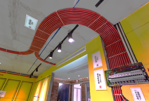 詳情施工(gong)工(gong)藝介紹:強電(dian)弱電(dian)分(fēn)筦(guan)分(fēn)色鋪設(shè)工(gong)藝:強電(dian)用(yong)白色線(xiàn)筦(guan)、弱電(dian)用(yong)藍色線(xiàn)筦(guan),保持30-50cm,強弱電(dian)交叉處用(yong)錫箔紙做遮蔽處理(li);水筦(guan)走(zou)吊頂,維(wei)修成(cheng)本(ben)低,減少熱量損失,減少地面空鼓。